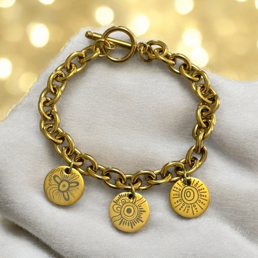This elegant piece features three 15mm stainless steel charms, each beautifully plated in 18k gold, suspended from a 19.5cm stainless steel cable chain, also 18k gold plated for a seamless, radiant finish.