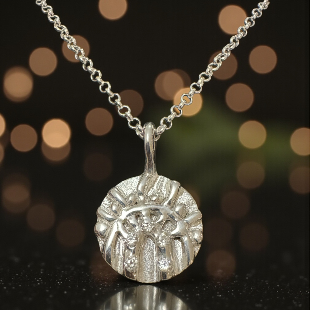 My Barlgarn Solid Silver Necklace is a fully handcrafted piece. I have hand rolled and moulded each section of this pendant (14mm Fine Silver .999), which sits on a 50cm Belcher Chain (.925 Sterling Silver). The symbol itself features 5 CZ , clear stones. I have made two of these necklaces only.