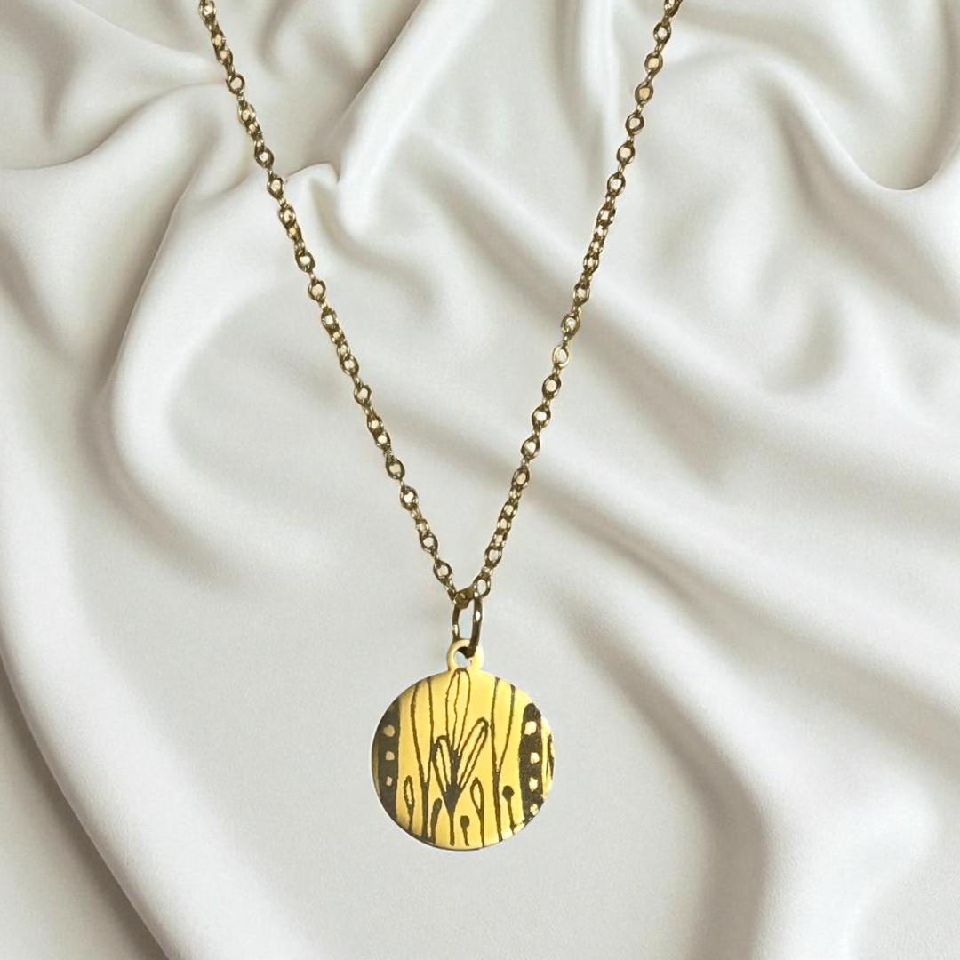 18K Gold: 15mm stainless steel pendant plated in 18k hold. 45CM stainless steel chain, plated in 18k Gold. High shine, mirror polish finish.