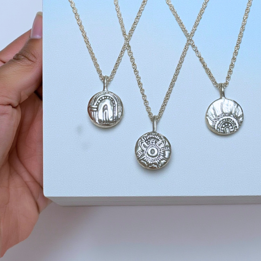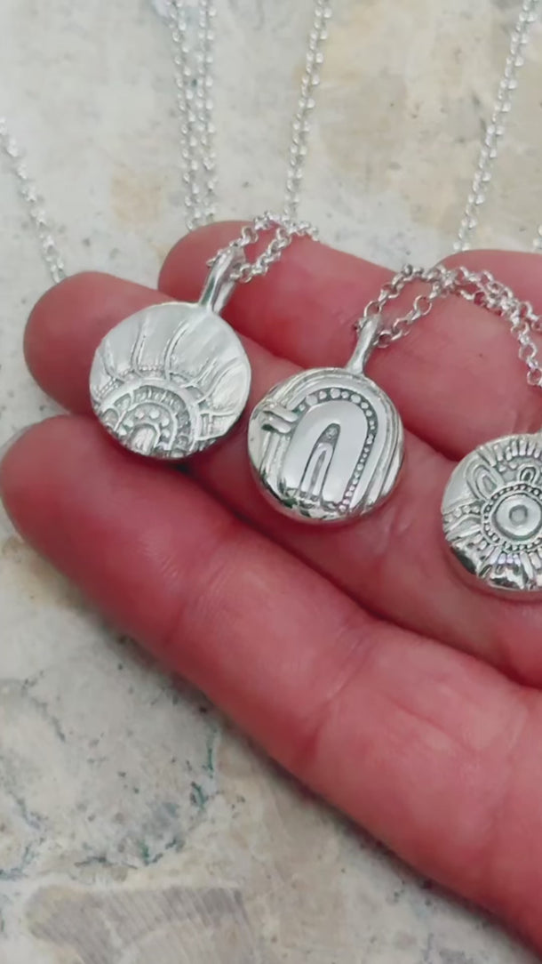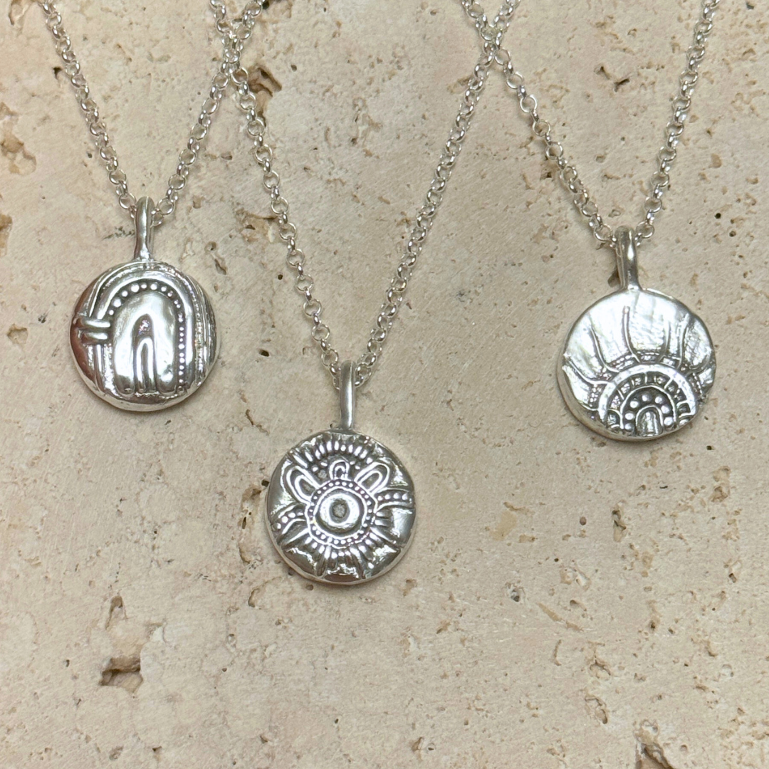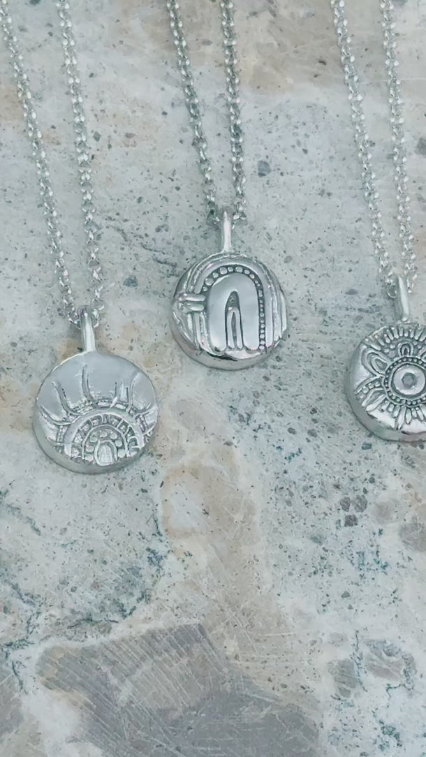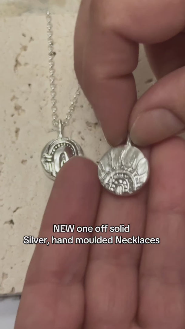 My hand moulded solid silver necklaces are a full handcrafted pendant. I have hand rolled and moulded each section of each pendant (14mm Fine Silver .999), which sits on a 50cm Belcher Chain (.925 Silver).  I have made one of each only.