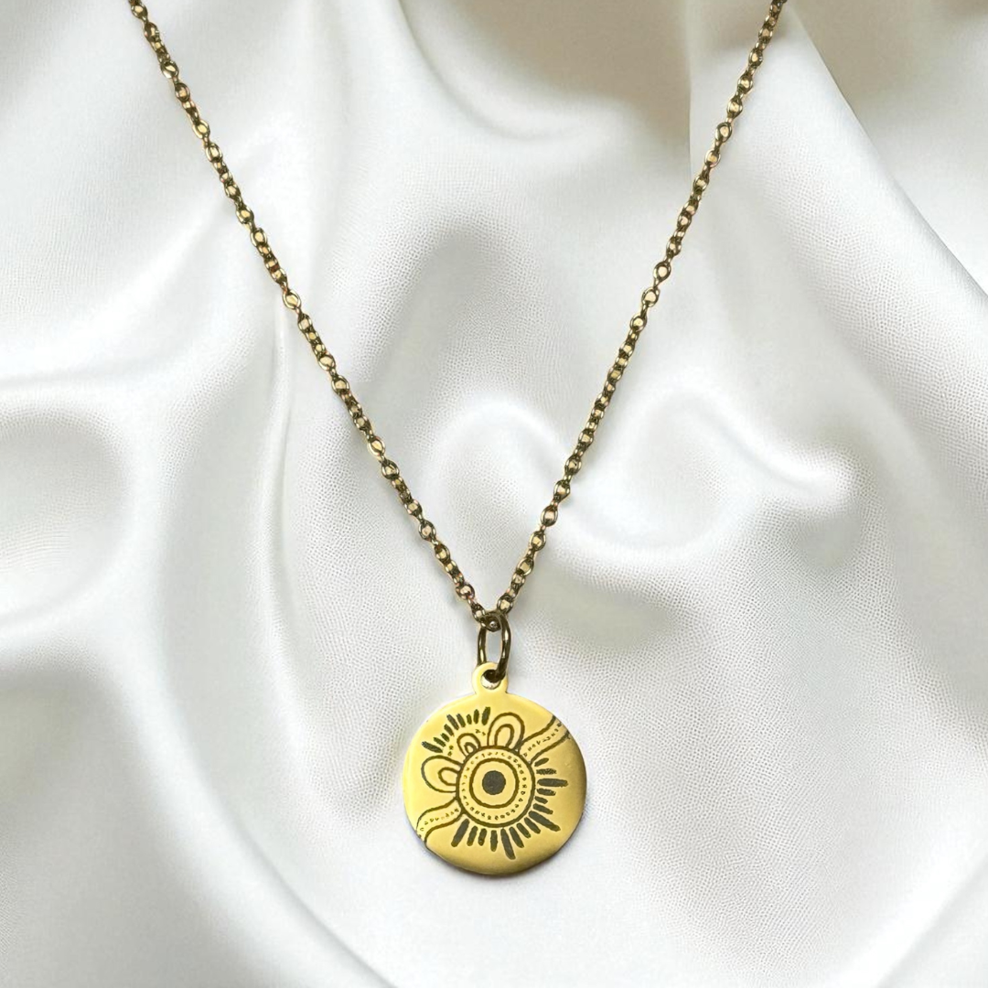 18K Gold: 15mm stainless steel pendant plated in 18k hold. 45CM stainless steel chain, plated in 18k Gold. High shine, mirror polish finish.