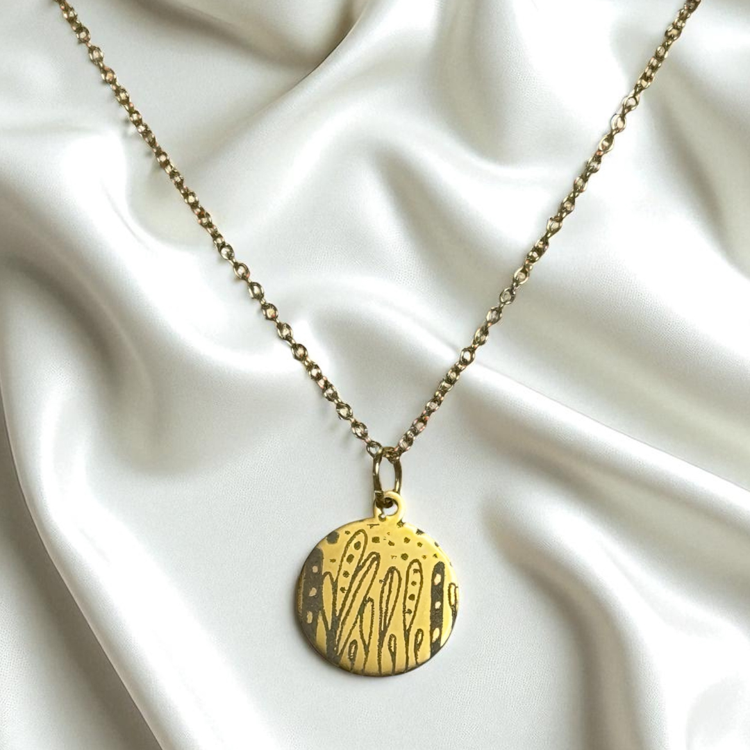 18K Gold: 15mm stainless steel pendant plated in 18k hold. 45CM stainless steel chain, plated in 18k Gold. High shine, mirror polish finish.