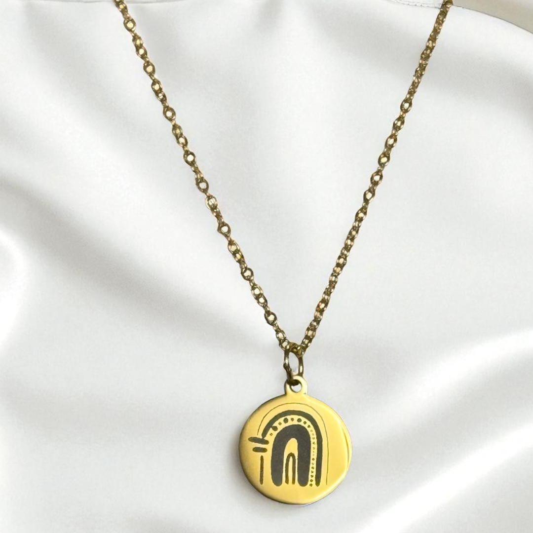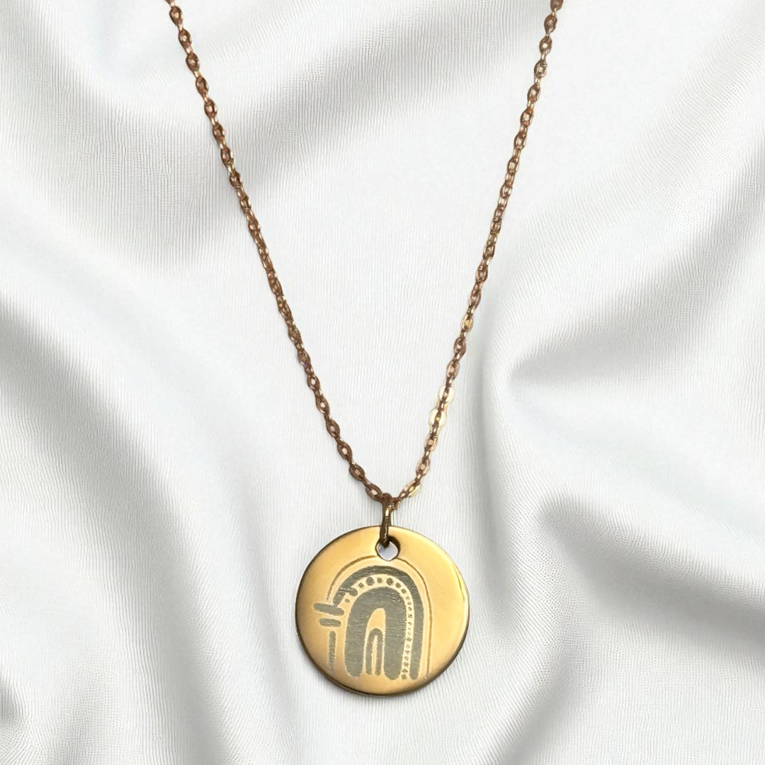 18K Gold: 15mm stainless steel pendant plated in 18k hold. 45CM stainless steel chain, plated in 18k Gold. High shine, mirror polish finish.